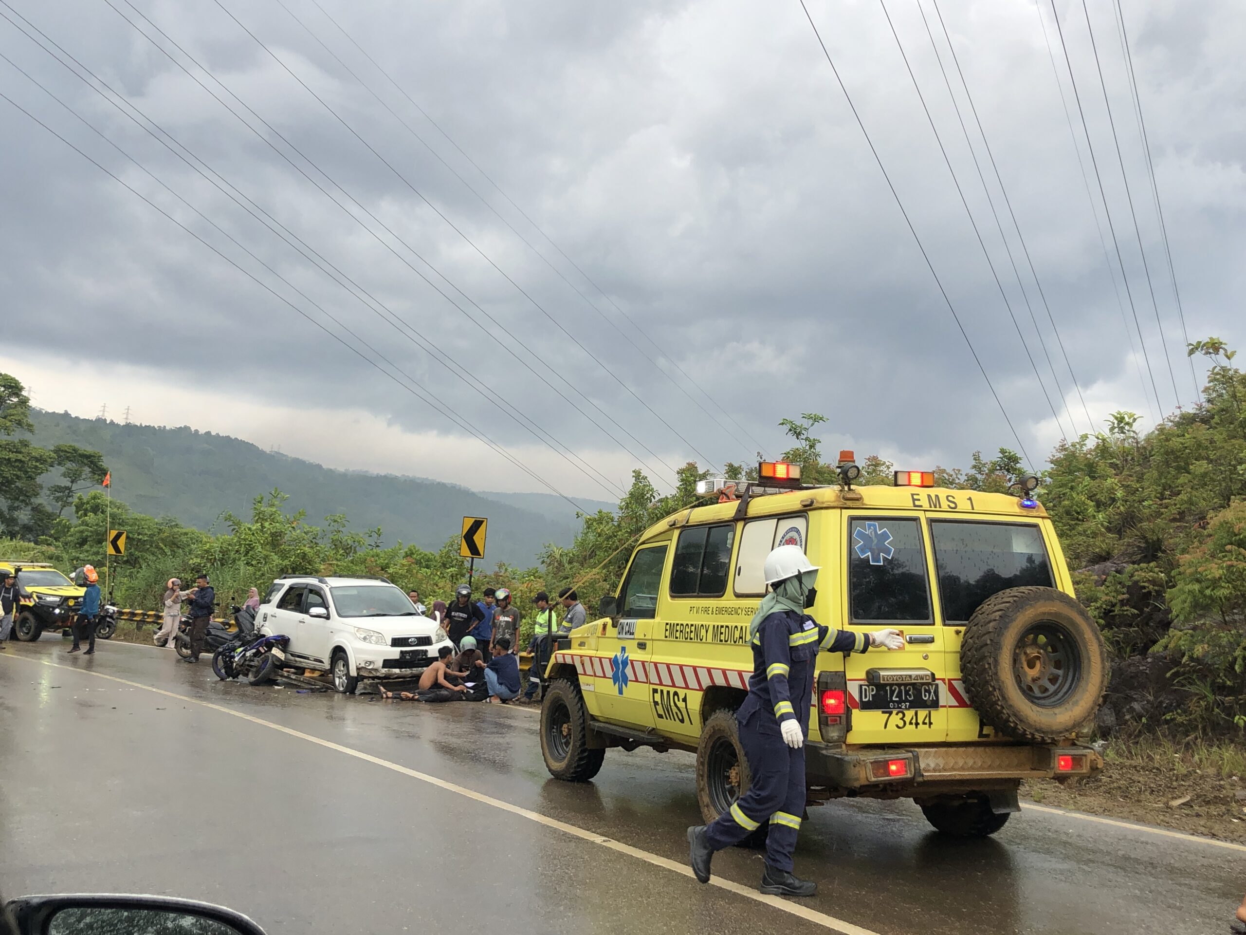 Aksaranusa, Luwu Timur – Telah terjadi kecelakaan lalu lintas (laka lantas) di jalan penurunan Palumba pada hari ini pukul 15.00 WITA. Peristiwa tersebut melibatkan 1 (satu) unit sepeda motor Yamaha MX King yang ditumpangi 2 (dua) orang serta 1 (satu) unit mobil berwarna putih.