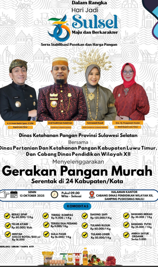 Aksaranusa, Luwu Timur – Dalam rangka memperkuat ketahanan pangan masyarakat, Pemerintah Kabupaten Luwu Timur bersama Pemerintah Provinsi Sulawesi Selatan menggelar Gerakan Pangan Murah (GPM) di halaman Kantor Cabang Dinas Pendidikan Wilayah XII, Malili, Jumat (1/11/2025). Kegiatan ini merupakan bagian dari peringatan Hari Jadi ke-356 Provinsi Sulawesi Selatan dengan tema “Sulsel Maju dan Berkarakter”.