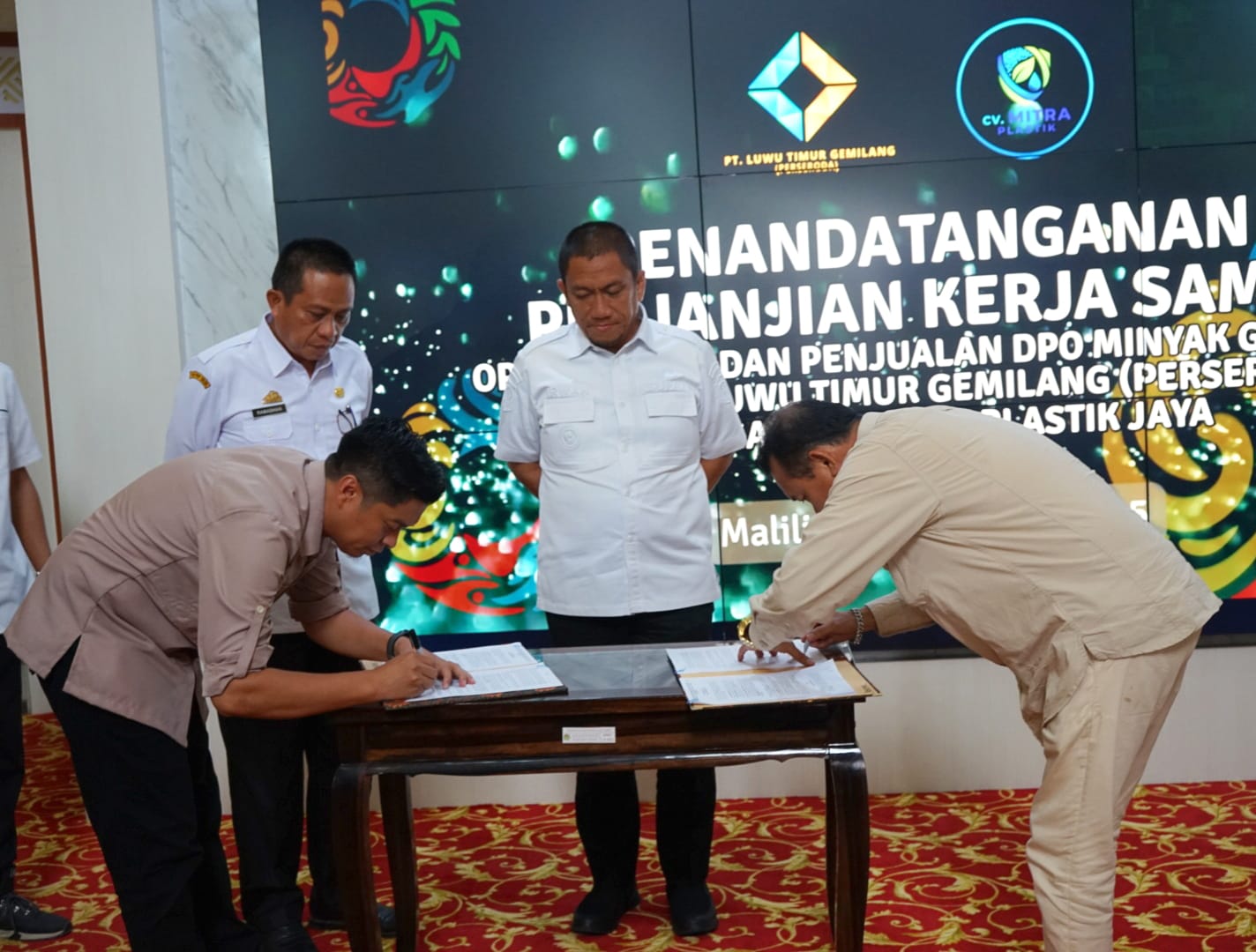 Aksaranusa, Luwu Timur – Sore ini, lobi Kantor Bupati Luwu Timur kembali menjadi saksi penandatanganan perjanjian kerja sama (MoU) operasional dan penjualan DPO minyak goreng antara PT. Luwu Timur Gemilang (Perseroda) dengan CV. Mitra Plastik Jaya (MPJ).