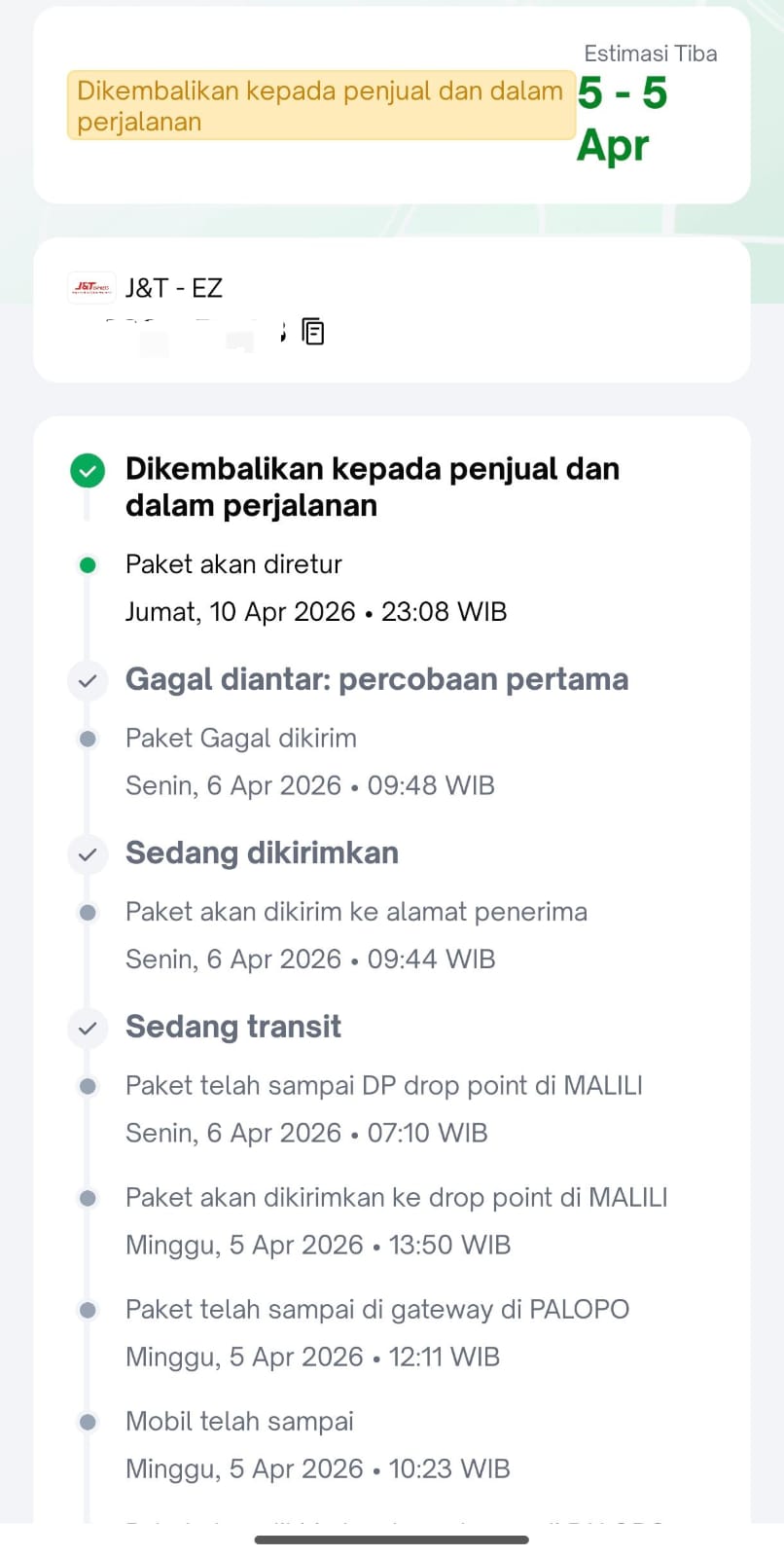 Aksaranusa, Luwu Timur, Sejumlah konsumen menyampaikan keluhan terkait paket yang dikembalikan (return) sebelum diterima oleh penerima, meskipun status pelacakan menunjukkan barang telah berada di gudang perusahaan jasa pengiriman J&T Express. Keluhan tersebut ramai disampaikan melalui media sosial dan kanal pengaduan konsumen dalam beberapa waktu terakhir. (11/04)