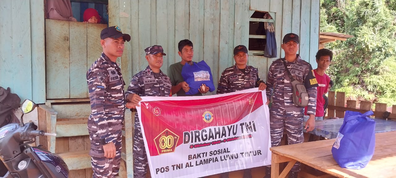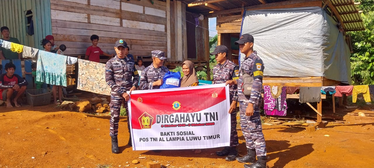 Aksaranusa, Luwu Timur – Warga pesisir Dusun Laoli, Desa Harapan, Lampia, Kabupaten Luwu Timur, menyambut hangat kehadiran personel Pos TNI AL (Posal) Lampia yang datang langsung ke rumah-rumah mereka membawa paket sembako. Sebanyak 25 paket bantuan dibagikan dalam rangka memperingati Hari Ulang Tahun TNI ke-80. (22/9)